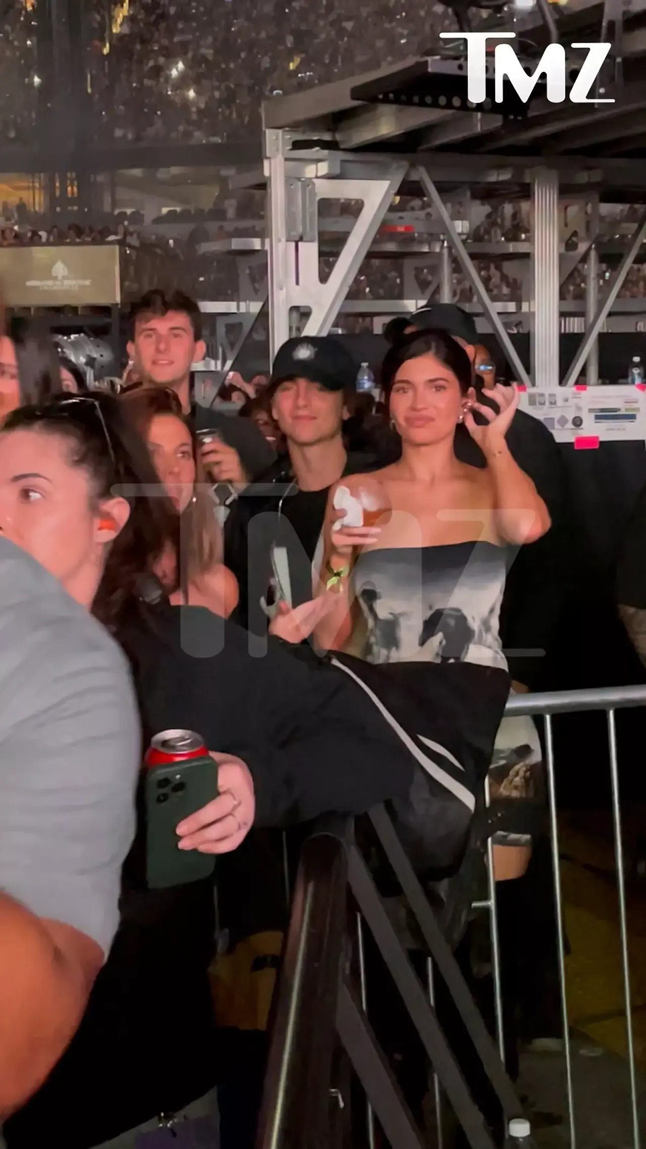 TMZ가 입수한 영상에는 두 사람이 콘서트를 즐기며 여러 차례 키스하는 모습도 포착되었습니다. 이날, 티모시는 검은 후디와 매치되는 야구 모자를 착용했으며, 카일리는 흡입귀걸이와 멋진 업도 헤어스타일에 검은 스트랩리스 탑을 입고 있었습니다.